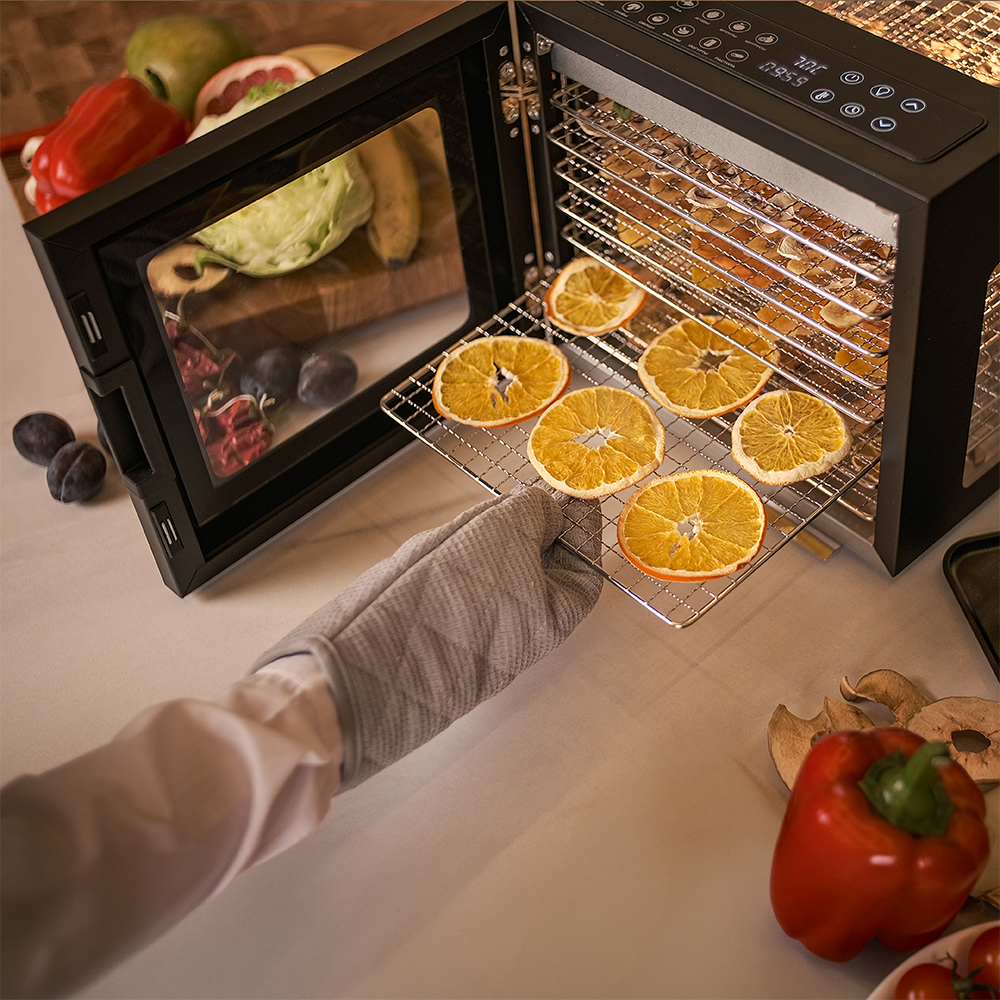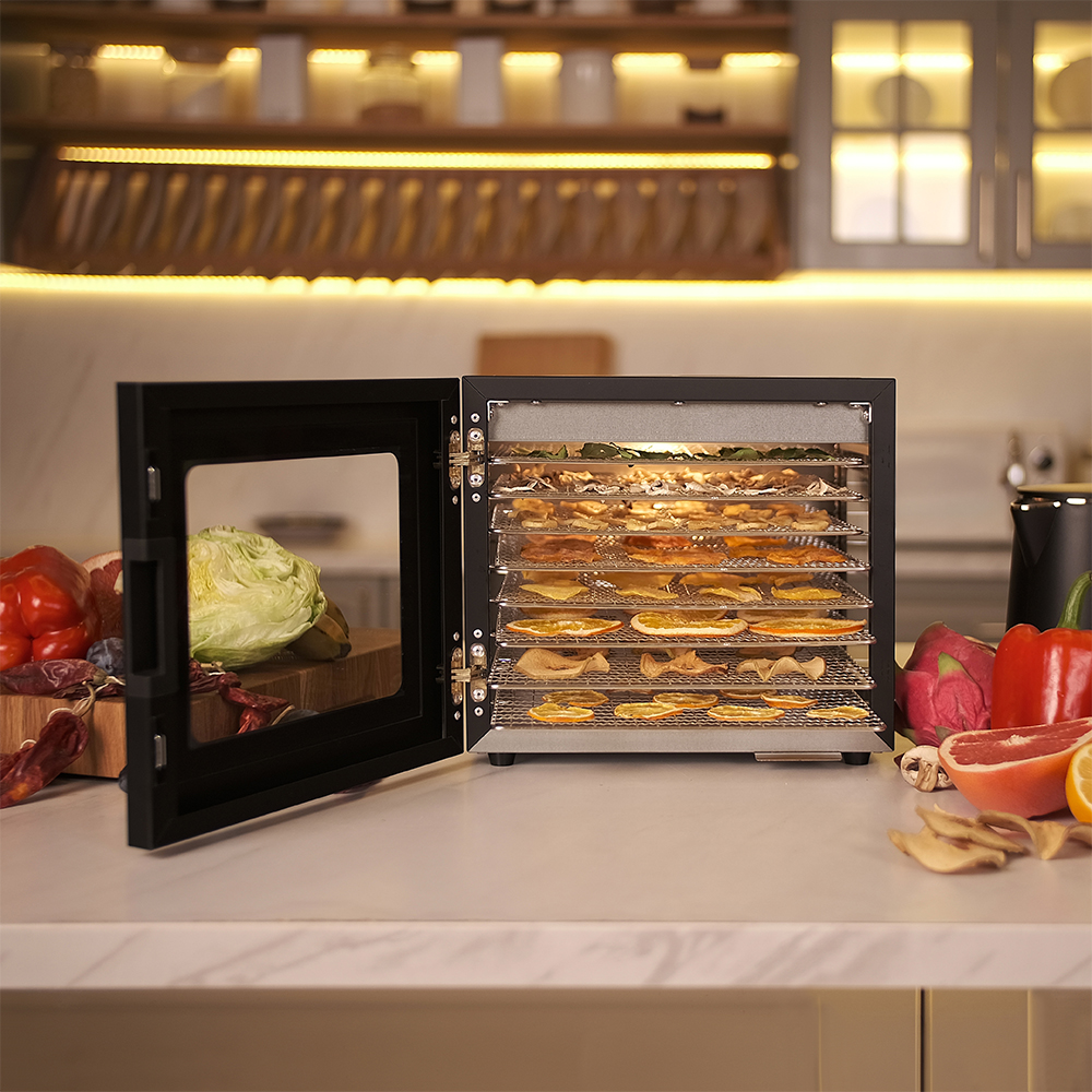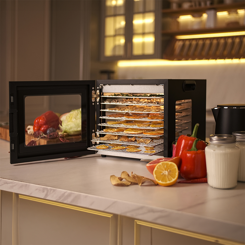 Чёрный корпус из нержавеющей стали, устойчивый к нагреву, влаге и коррозии, выглядит лаконично и современно, легко вписывается в интерьер кухни или мастерской. Внутри установлено 8 поддонов из нержавеющей стали с зазором 25 мм — этого достаточно, чтобы удобно размещать ломтики фруктов, травы или мясные полоски.