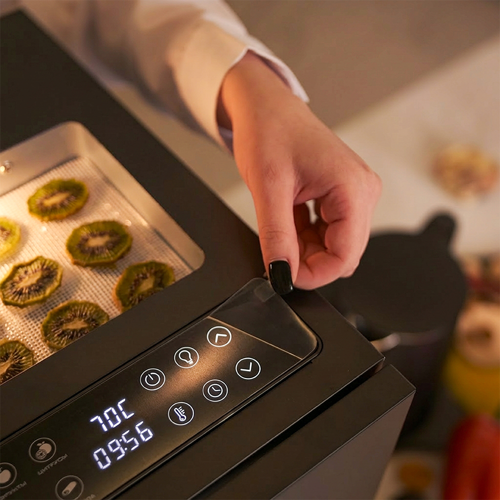 Дегидратор оснащён сенсорной панелью, которая значительно упрощает процесс настройки. Никаких механических рычагов и лишних кнопок — всё управление сосредоточено в одном месте.