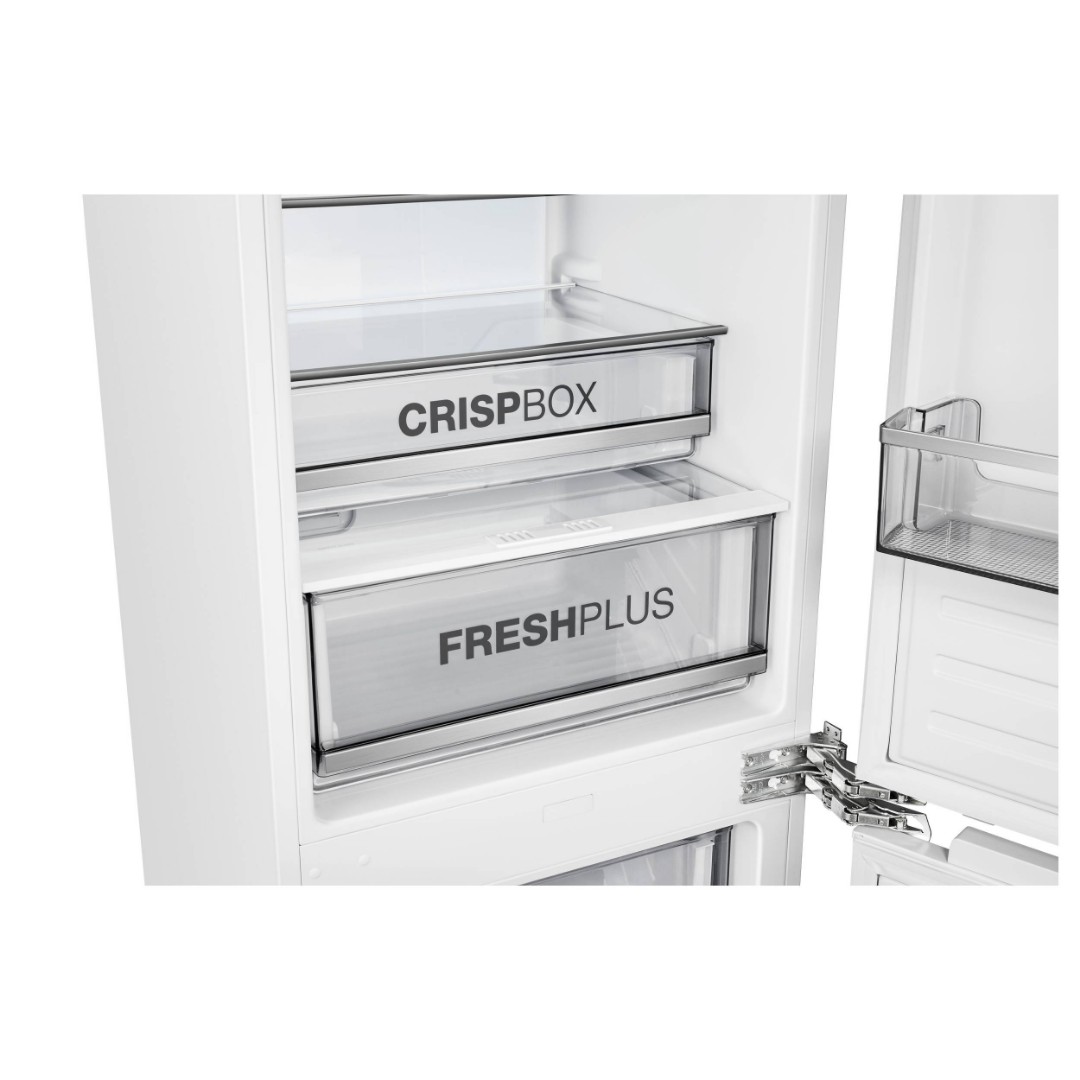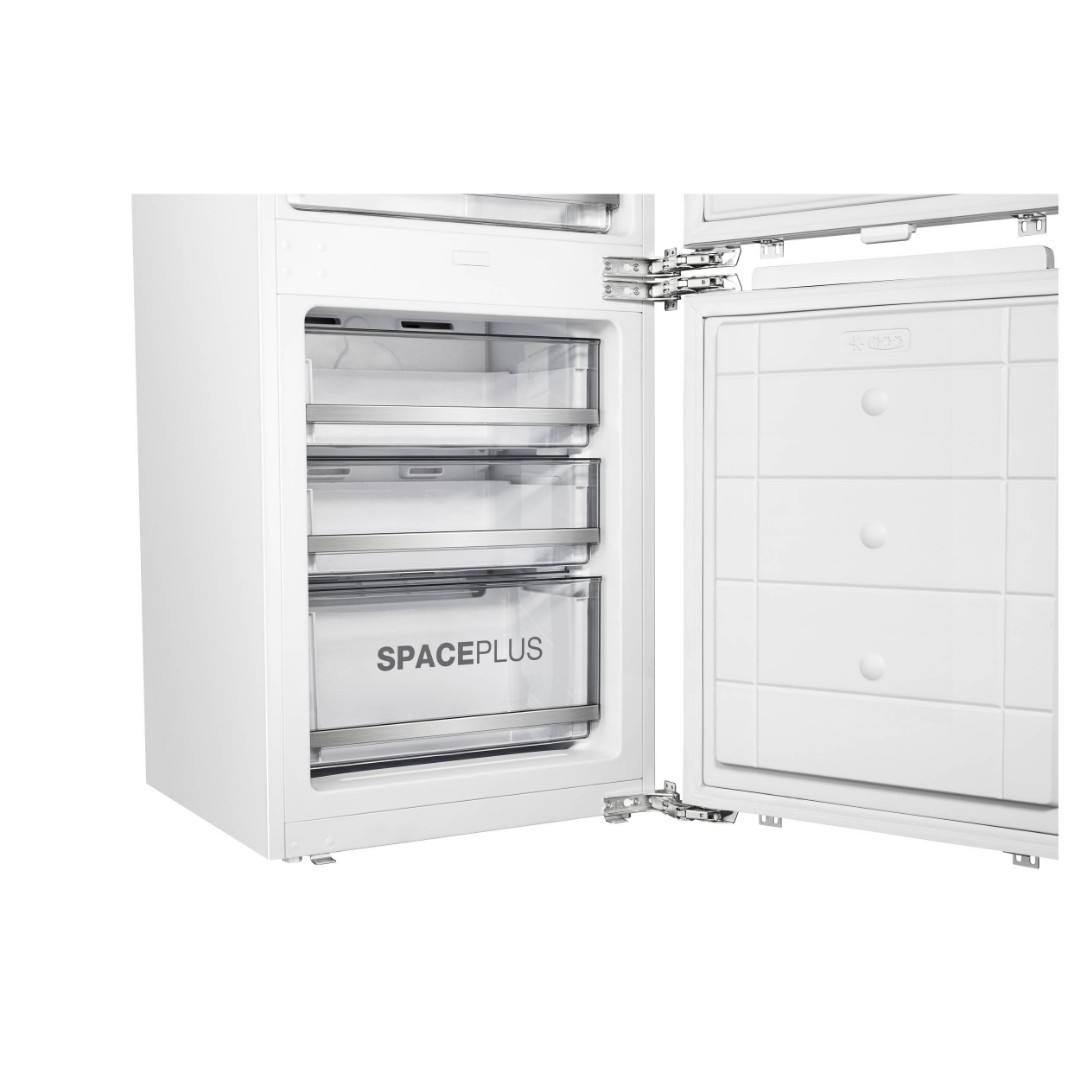 Модель оснащена функциями интенсивного охлаждения и заморозки, дополнительными особенностями являются отделение FreshPlus с электронной регулировкой температуры, большой ящик для овощей CrispBox и увеличенный ящик SpacePlus в морозильном отделении. Благодаря инверторному компрессору уровень шума составляет всего 41 дБ, что обеспечивает тихую и комфортную атмосферу. Такой компрессор значительно продлевает срок службы прибора и способствует снижению энергопотребления. Габариты прибора (ВхШхГ) составляют 1937×540×540 мм; размеры для встраивания – 1939-1942×562×560 мм.